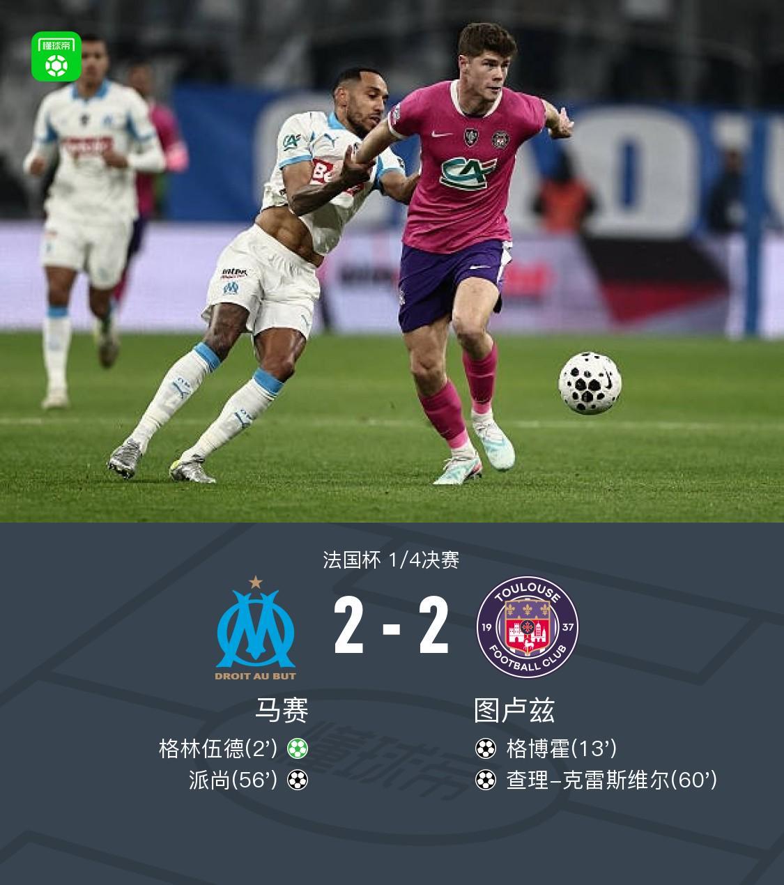 北京时间3月5日法国杯 1/4决赛,马赛对阵图卢兹。马赛格林伍德破门,派尚破门。图卢兹格博霍破门,查理-克雷斯维尔破门。最终比分马赛 2-2 图卢兹。