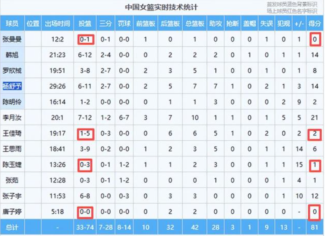 内线表现高光,但是,中国女篮的外线却出现了明显的短板,尤其新人表现拉胯。首发控卫张曼曼全场0分0助攻,王佳琦、陈玉婕合砍仅3分,三人外线合计9投1中、三分5中0;锋线新人唐子婷出场7分钟,0分入账,攻防两端存在感薄弱。显然,中国女篮这些新的“血液”,没有起到作用。